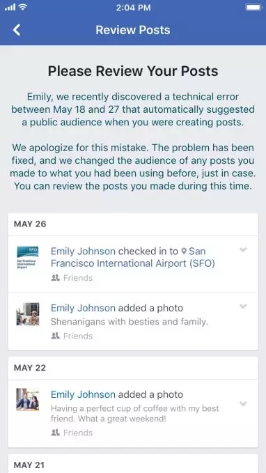 Facebook首席隱私官埃琳·伊根(Erin Egan)在一份聲明中稱,“從今天起我們將向受影響的用戶通報(bào)此事,要求他們?cè)u(píng)估在此期間發(fā)布的帖子。我們?yōu)檫@一失誤向用戶表示歉意?!?/span>
