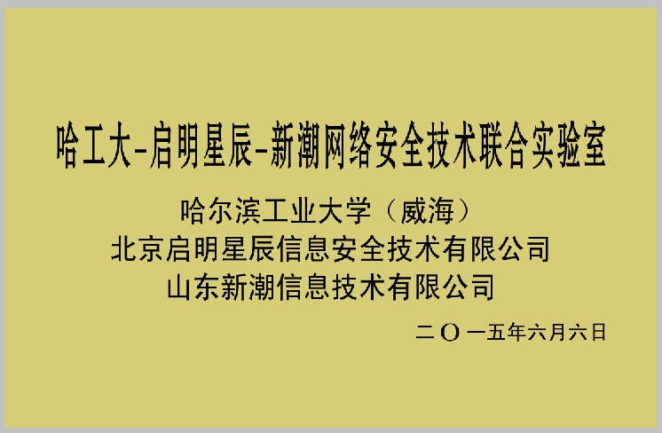 2015年6月6日,山東新潮信息技術(shù)有限公司與哈爾濱工業(yè)大學(xué)(威海)、北京啟明星辰信息安全技術(shù)有限公司就成立“網(wǎng)絡(luò)安全技術(shù)聯(lián)合實(shí)驗(yàn)室”達(dá)成了協(xié)議,并在哈工大(威海)舉行了簽約、授牌儀式。哈工大副校長(zhǎng)和計(jì)算機(jī)科學(xué)與技術(shù)學(xué)校院長(zhǎng)參加了揭牌儀式。各方代表就進(jìn)一步合作達(dá)成了共識(shí),將發(fā)揮各自的優(yōu)勢(shì)資源和特長(zhǎng),通過聯(lián)合實(shí)驗(yàn)室共同開展工作,實(shí)現(xiàn)產(chǎn)學(xué)研的優(yōu)勢(shì)結(jié)合。